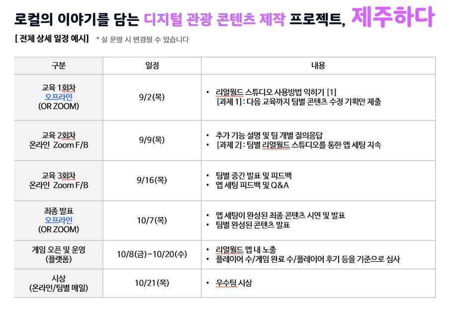 *1회차 교육과 4회차 최종발표는 제주에서 오프라인으로 진행됩니다. 참가자는 모든 일정에 참석해야만 합니다.